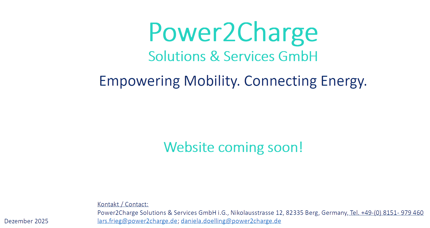 Kontakt / Contact: Power2Charge Solutions & Services GmbH i.G., Nikolausstrasse 12, 82335 Berg, Germany, Tel. +49 (0) 8151- 979 460